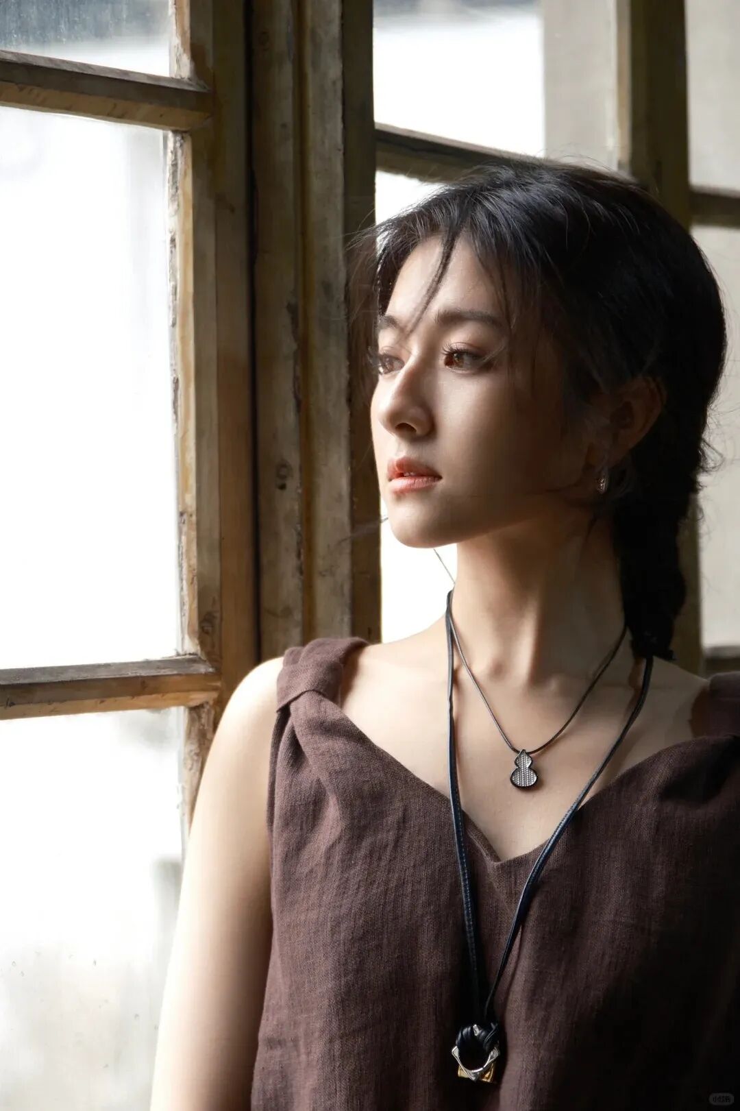 尤其是她那双水灵灵的眼睛,看起来就很有故事,里面似乎蕴含着无数情感。看了后会觉得,这张脸很适合出现在荧幕上。这应该是一组有主题的拍摄,同样的教室背景,她换了几套造型,但都是那种素净、温柔的风格。